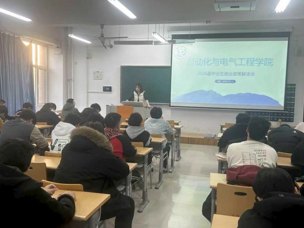 为帮助2026届毕业生精准把握就业形势、吃透就业政策,切实提升求职核心竞争力,2025年11月27日,自动化与电气工程学院在11教107教室召开2026届毕业生就业政策解读会,辅导员王莉主持,2026届全体毕业生参会。