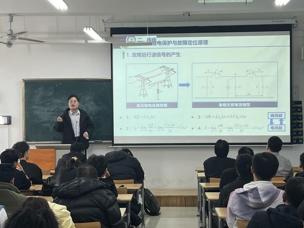 在报告过程中,王栋教授紧密围绕国家能源战略部署,以全球能源转型这一宏观背景为依托,深刻阐释了海上风电、潮汐能等清洁能源所蕴含的重大战略价值。同时,结合我国海洋资源丰富的优势以及“双碳”目标要求,既阐述了清洁能源的战略价值,又分析了我国在该领域的发展现状,着重强调了其在优化能源结构方面的关键作用,并系统剖析了传统技术存在的适应性短板。此外,王栋教授重点分享了两大创新成果。在故障定位新原理方面,创新性地提出多源信息融合方法,通过整合监测与环境数据对算法进行优化,有效解决了“定位不准、响应滞后”的问题;在继电保护新原理方面,充分结合新能源波动性特点,研发出自适应保护方案,实现了故障的快速识别与可靠动作。在互动环节,师生们就抗干扰技术、设备可靠性等问题踊跃提问,王栋教授逐一进行了专业且详尽的解答,并分享了宝贵的科研经验,现场交流氛围热烈浓厚,学术探讨深入透彻。