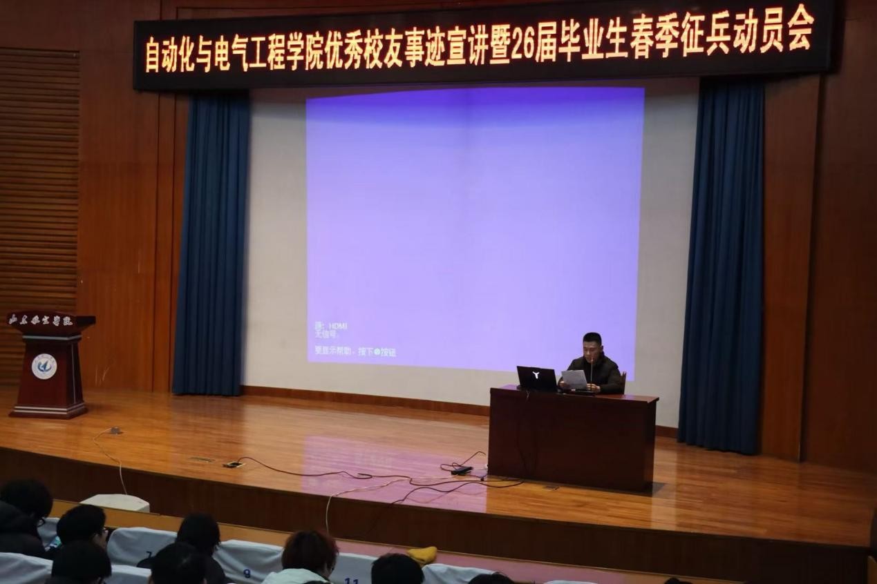 为充分发挥优秀校友榜样示范引领作用,进一步激发全院学子参军报国、建功立业的责任感与使命感,扎实推进2026届毕业生春季征兵工作,结合大思政课建设安排,2025年12月21日,自动化与电气工程学院于明德报告厅举办优秀校友事迹宣讲暨2026届毕业生春季征兵动员会,学院“E课堂”宣讲团邀请2023届毕业生陈志超进行宣讲,辅导员王莉主持,全体2026届毕业生参会。
